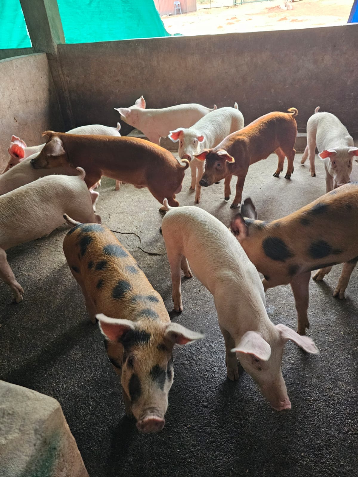 Duroc pigs are known for their reddish-brown color and muscular build. They are renowned for producing high-quality pork with excellent marbling, making them a popular choice among farmers.